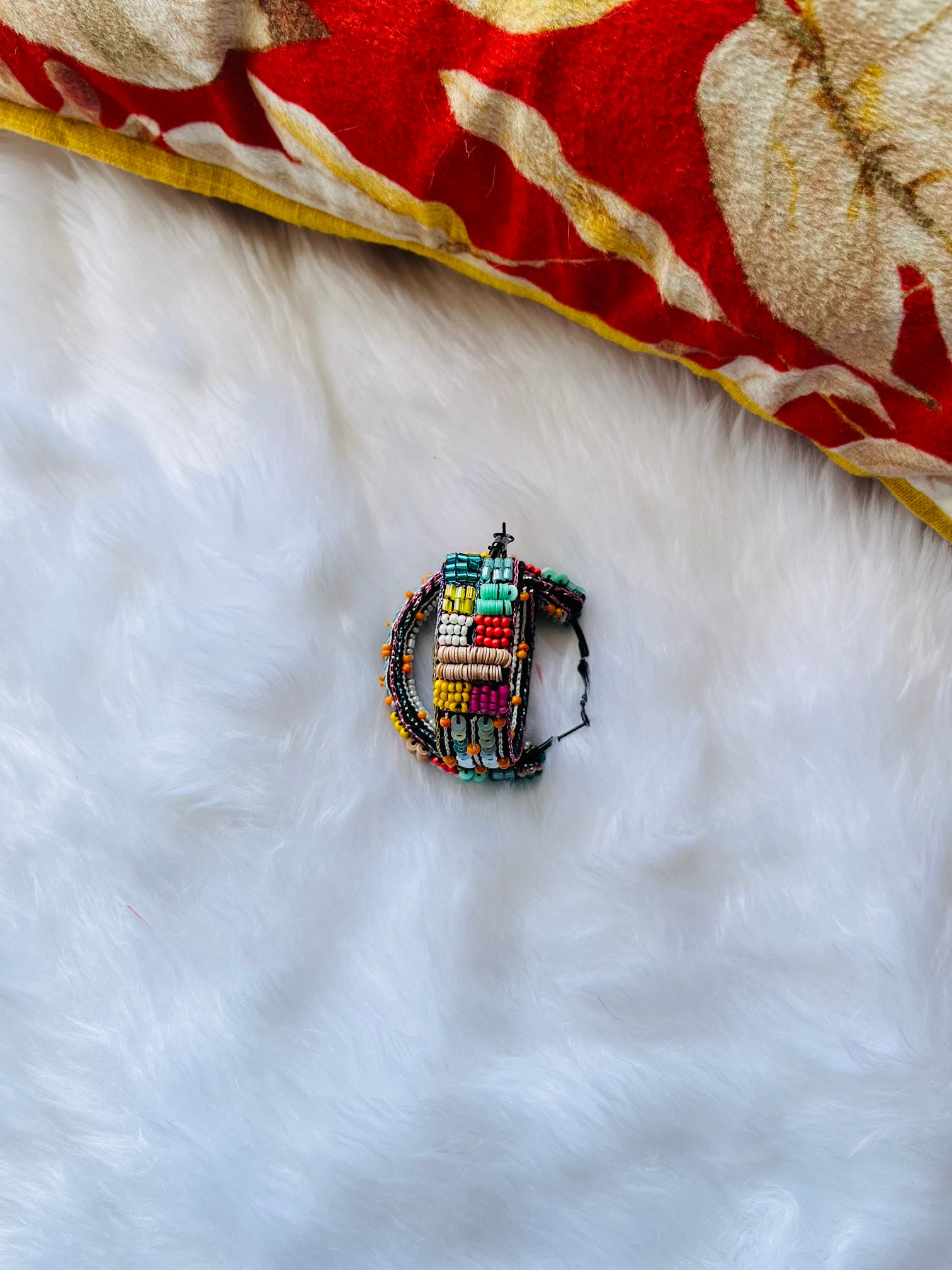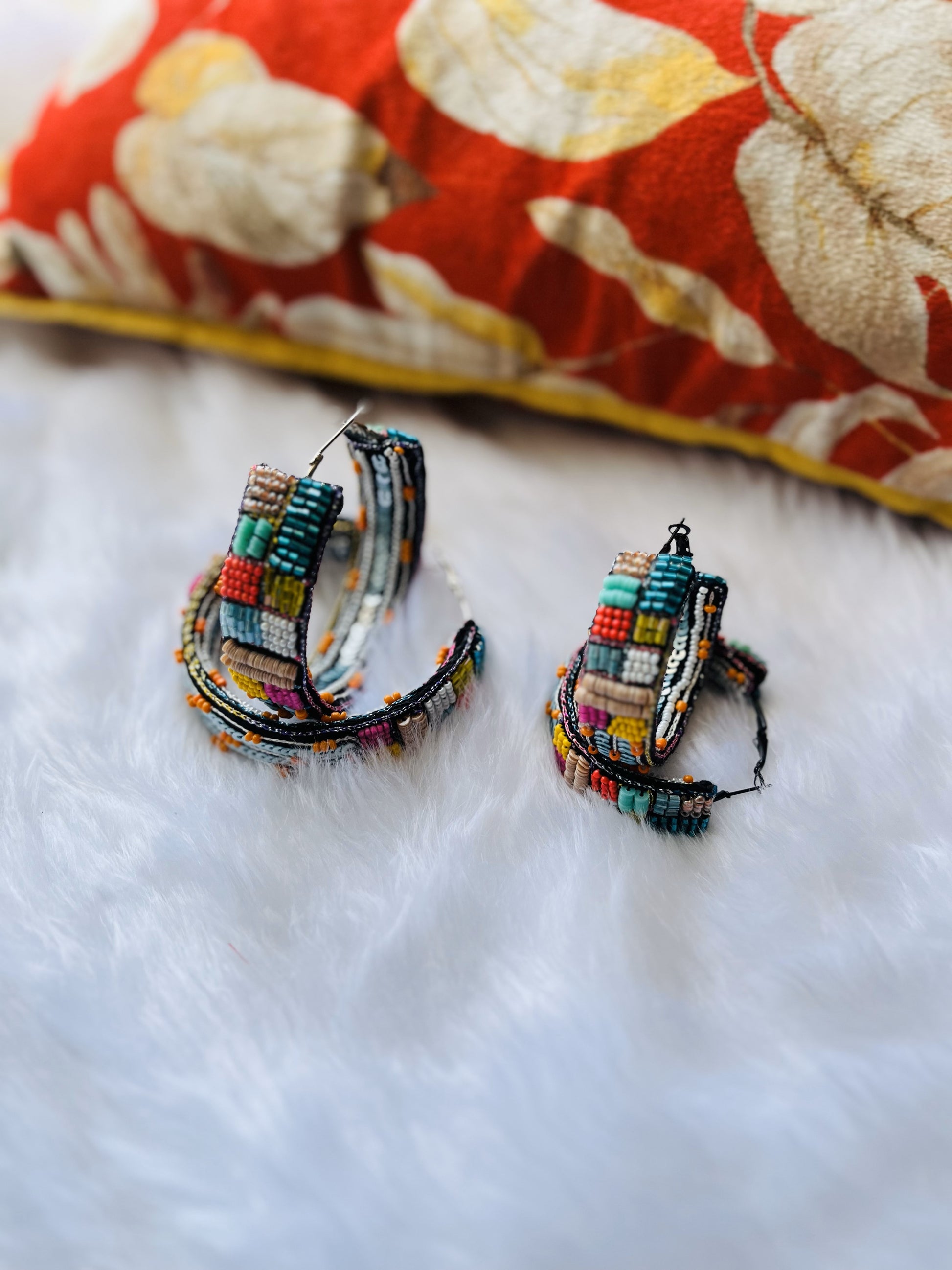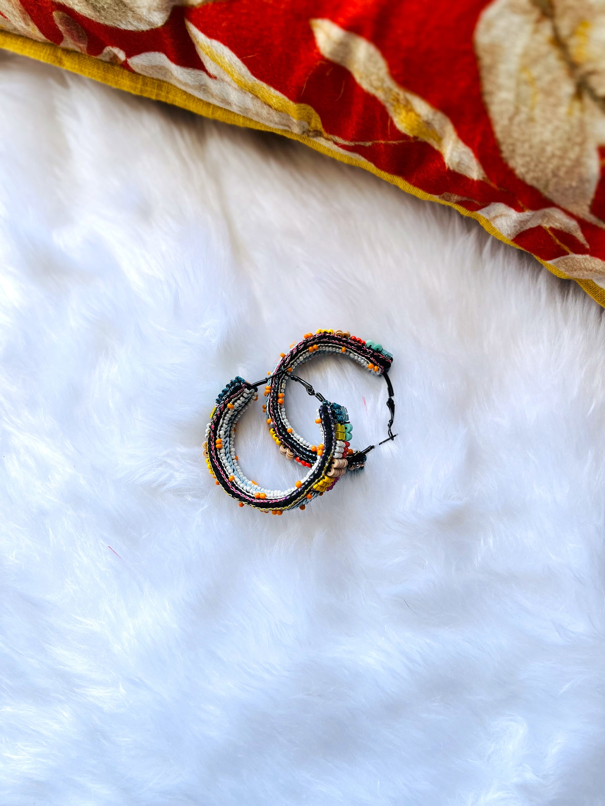 For days you don’t feel too “Colorful” or Bold, you can still feel your elegant self with the stunning multicolored Small Rabdi Hoops. Laced with glass bead/katdana/sequins on a black base.
